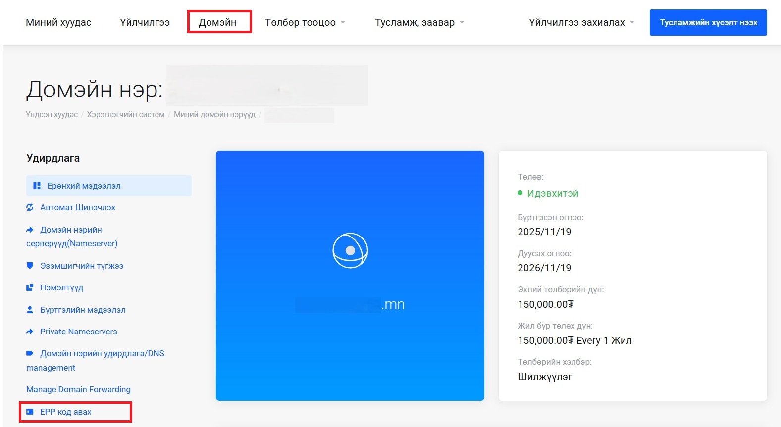 1. Домайн байгаа газрынхаа удирдлагаруу ороод GET EPP - код дээр дарахад үсэг тоо холилдсон код гарч ирнэ. Хэрэглэгчийн системээрээ нэвтрэн Домэйн цэсний Домэйн манайд шилжүүлэх дээр дарна.