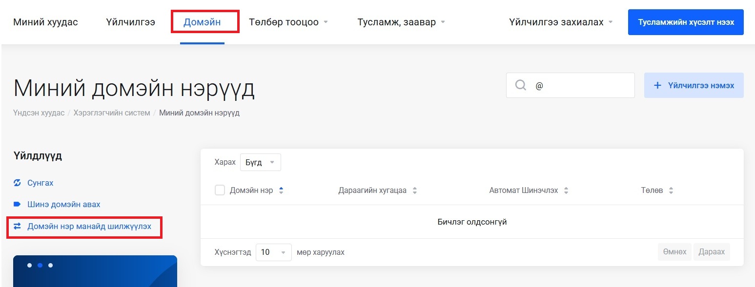 Хэрэв та домайн нэрээ Монгол доторх өөр нэг бүртгэгч байгууллага руу шилжүүлэх хүсэлтэй бол, шинэ бүртгэгчээсээ USER MAIL болон USER ID авах шаардлагатай. Энэ мэдээллээ борлуулалтын албанд тусламжийн хүсэлт илгээх замаар илгээнэ үү.