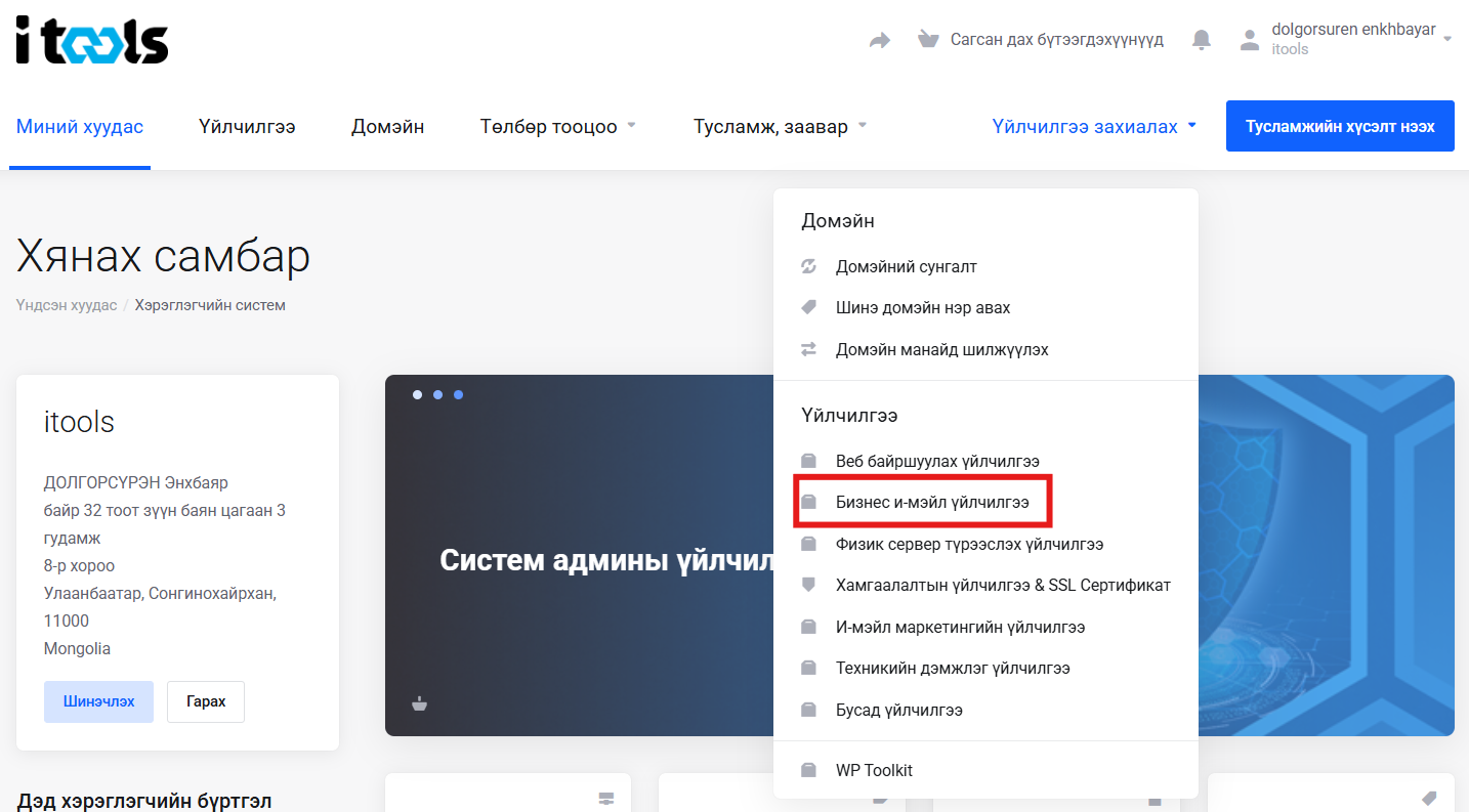 Нэвтэрсний дараа үндсэн нүүрний Үйлчилгээ захиалах хэсгээс Бизнес и-мэйл үйлчилгээ-г сонгоно.