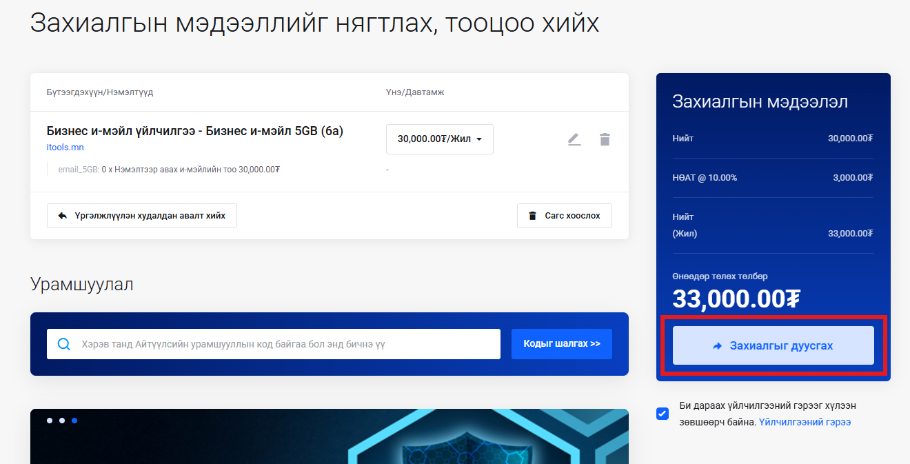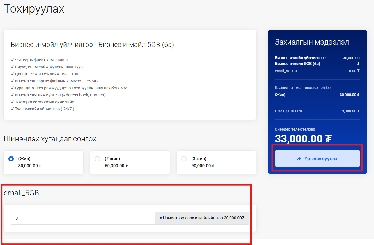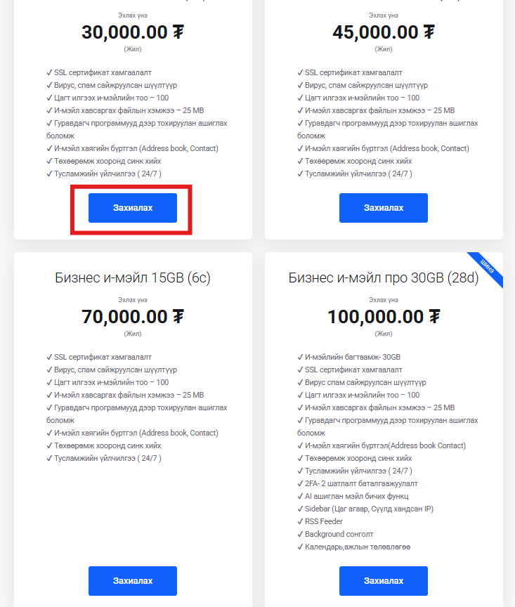 Өөрт тохирох багтаамжтай мэйл үйлчилгээг сонгон Захиалах товчийг дарна.