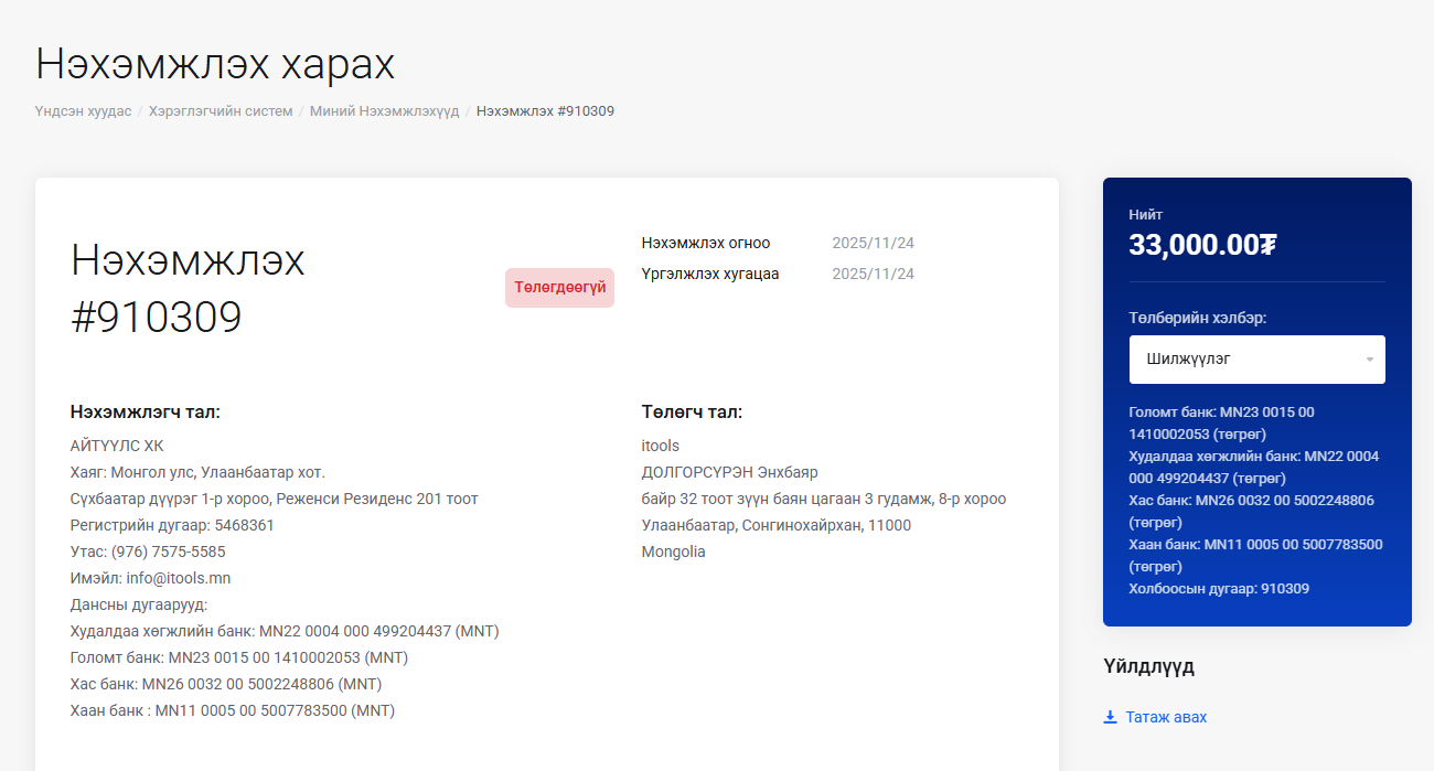Захиалга дуусгасны дараа Төлөгдөөгүй төлөвтэй нэхэмжлэх үүснэ. Төлбөр төлөх төрлөө сонгон төлбөрөө төлнө.